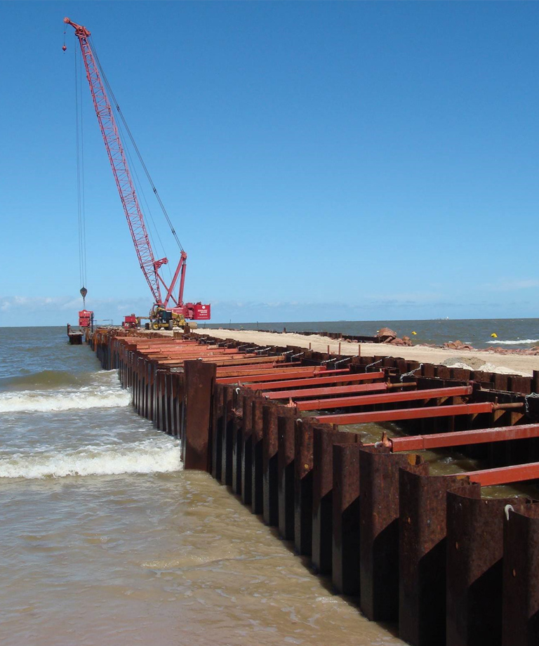 En ambos casos, las tablestacas de acero son una solución óptima, puesto que son versátiles en cuanto a dimensiones en planta, la variedad de secciones disponibles en el mercado permite optimizar las soluciones de diseño y los rendimientos obtenidos en la instalación superan los de cualquier otro sistema. Por ello, existen muchos ejemplos de proyectos en los que las pantallas de tablestacas se utilizan para infinidad de soluciones relacionadas con obras hidráulicas, marítimas y portuarias: muelles de atraque en puertos, rampas RO-RO, emisarios, desaladoras, muelles Syncrolift, ejecución de presas hinchables, etc.