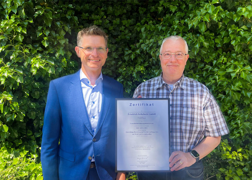 La certificación ISO 14001 es una norma reconocida internacionalmente para los sistemas de gestión medioambiental que establece los criterios que deben cumplir las empresas para medir y monitorizar el impacto medioambiental y reducirlo continuamente. FRIEDR. ISCHEBECK GmbH cumple los estrictos criterios establecidos por la “International Organization for Standardization (ISO)” para las normas de gestión medioambiental.