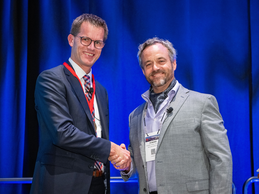Björn Ischebeck recibe las felicitaciones en representación de su padre de parte del Dr. Howard Perko, quien realizó la entrega del premioBjörn Ischebeck y sus colegas de la delegación estadounidense celebran el premio