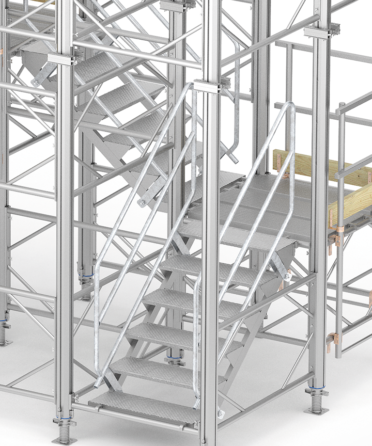 El siguiente paso para el sistema de cimbras Alu-TITAN: la escalera para cimbra de aluminio TITAN y la plataforma con hueco de paso junto con la escalera telescópica de aluminio, encajan en el sistema modular ISCHEBECK TITAN.